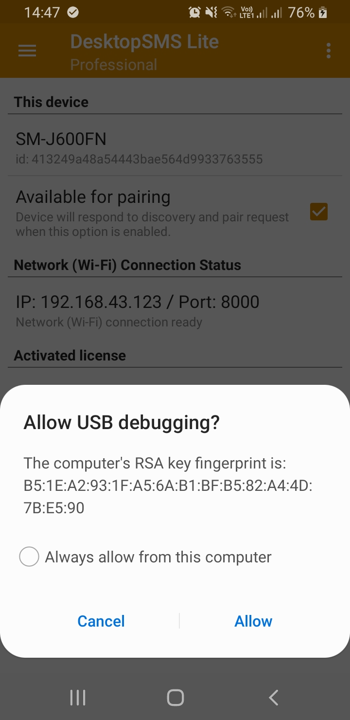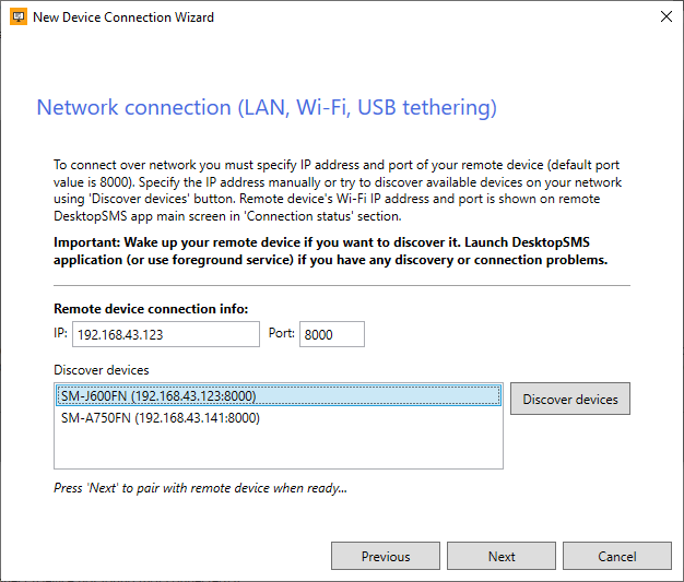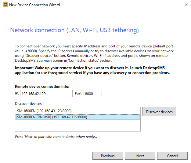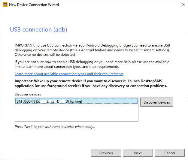 - When discovering device, device screen must be turned on and unlocked and the DesktopSMS app must be running on foreground.