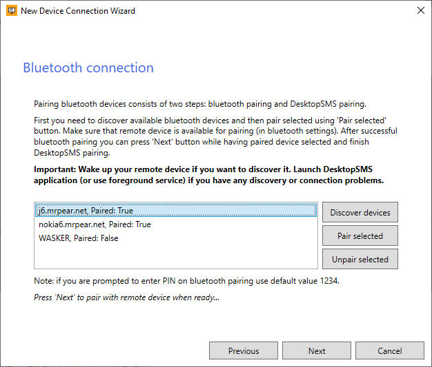 In the example above there are three discovered devices that were discovered after pressing Discover devices button. First two devices are already paired on bluetooth level (Paired: True) and it's not necessary to pair them again. Any paired device can be selected and paired with DesktopSMS remote device by pressing Next button.