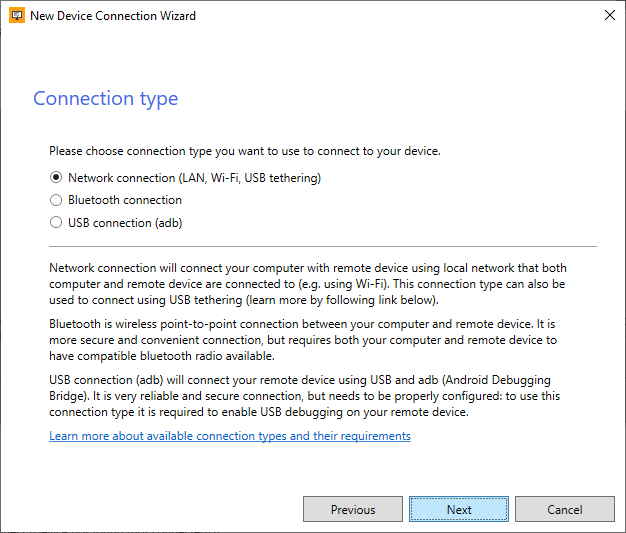 There are three main connection types available to choose from when pairing new devices. The first and most generic is a Network connection that allows you to connect over Wi-Fi or any other network related connection (e.g. USB tethering or wired LAN).
