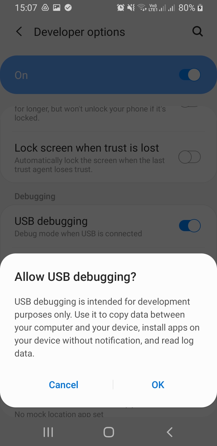 - Check if the USB debugging is enabled on a remote device (in Developer settings screen).
